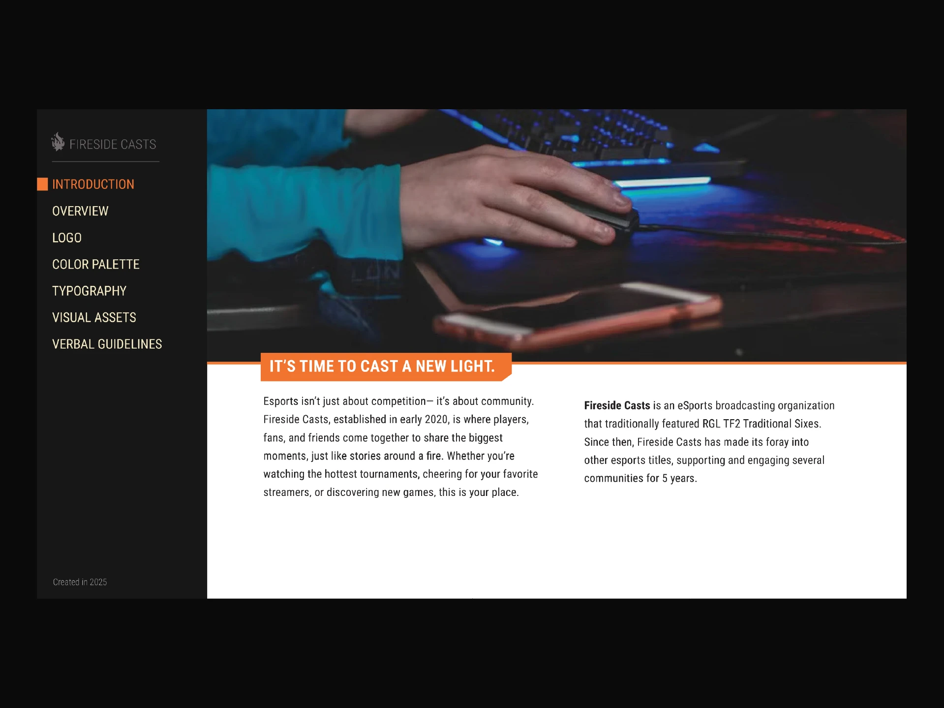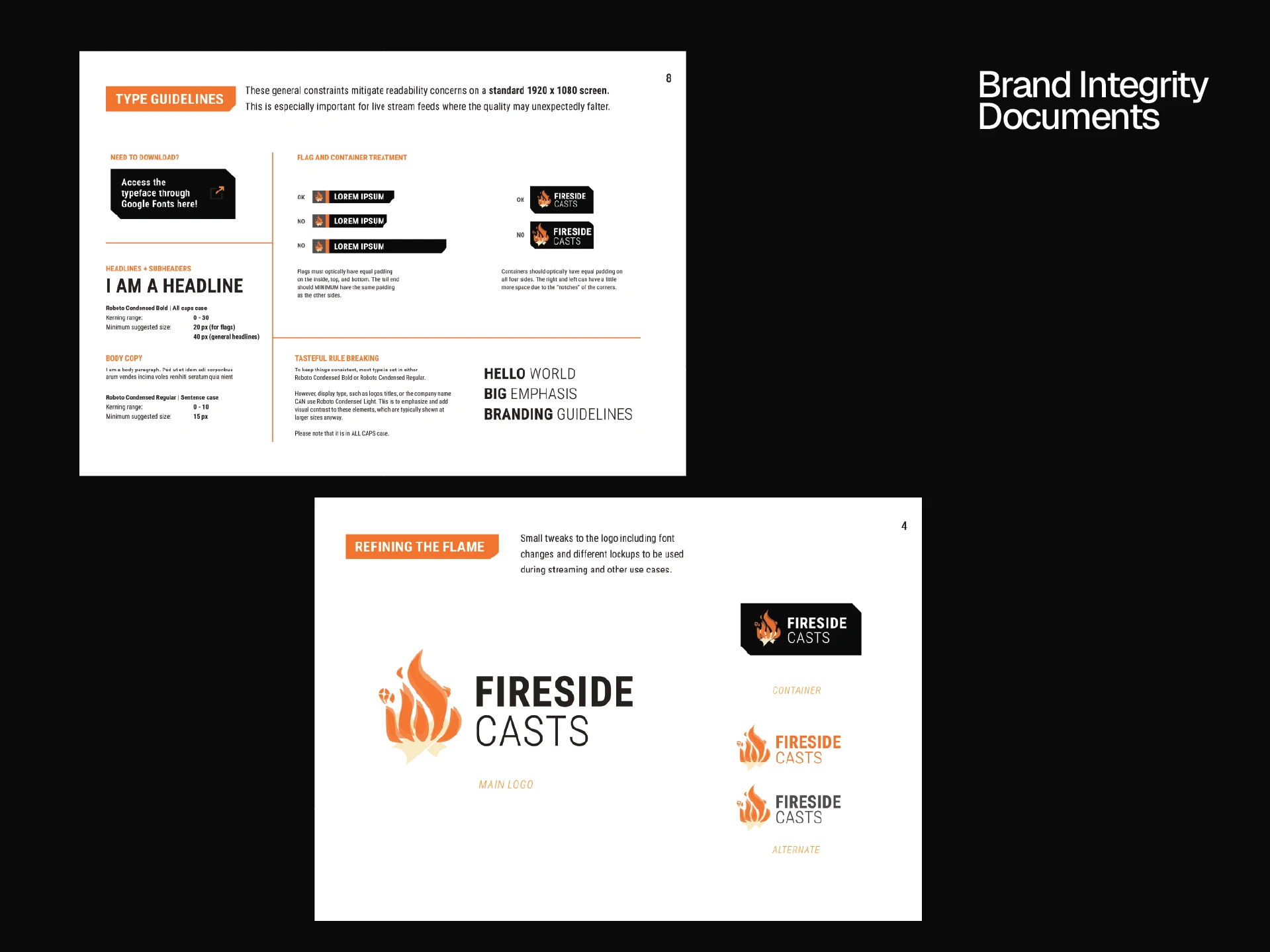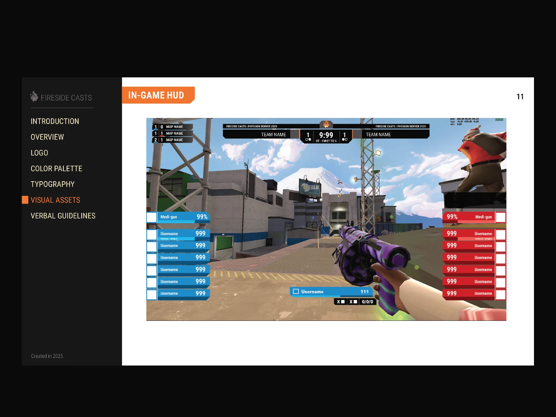 I made multiple editable templates that were handed off to the Fireside Casts team's developer. Taking from popular gaming tourneys, the design enhanced the viewing experience and had easily recognizable iconography. For longevity, I created a brand design document for their team to easily reference.