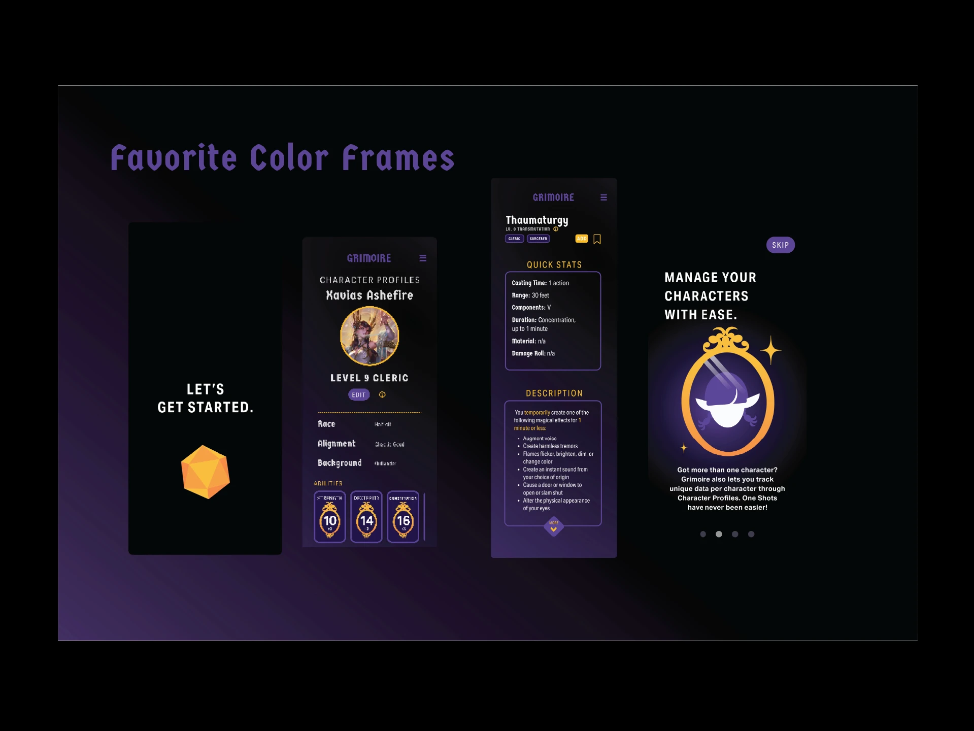 Dungeons and Dragons is a painstakingly overwhelming game, especially for spellcasters. This makes it difficult for newcomers and veteran players alike. Grimoire seeks to put all the statistics and information a spellcaster might need in one simple app, no matter the experience level.